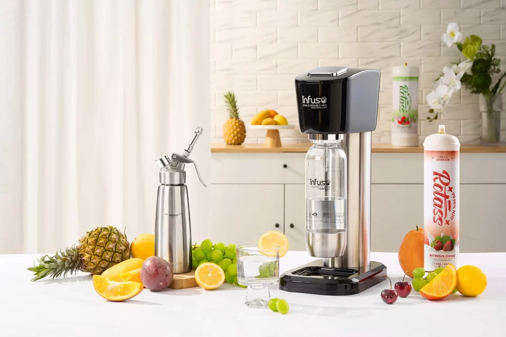 Rotass-Infuso includes cylinders and a soda machine for instantly sparkling and flavoring water at home. The new Infusoscent diffuses fragrances and essential oils by room and mood—relaxing, uplifting, focusing, or refreshing—for deeper, longer-lasting scent.